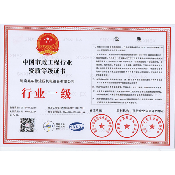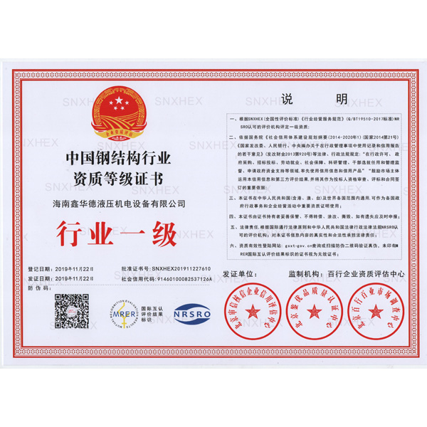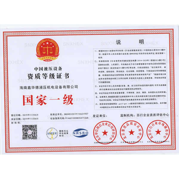 液壓設(shè)備資質(zhì)證書(國家一級(jí))