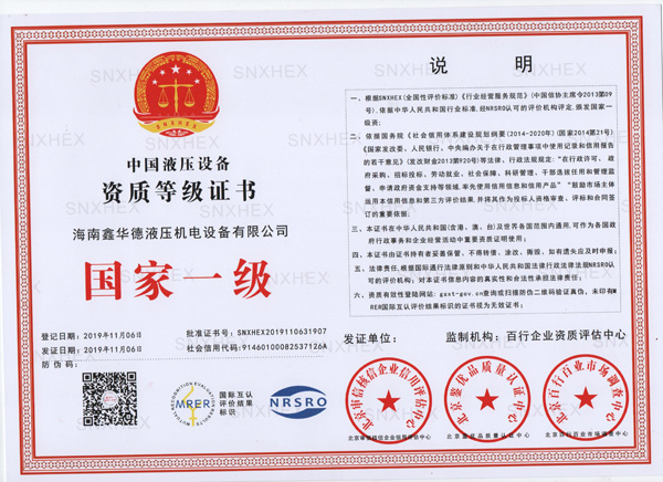 液壓設(shè)備資質(zhì)證書(國家一級)